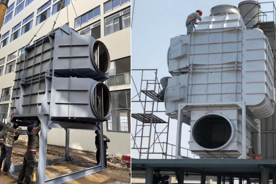 在磷化工、石墨、有色冶煉等行業(yè),生產(chǎn)排放的飽和濕煙氣與低溫環(huán)境空氣接觸時(shí),在煙氣溫度下降過程中,煙氣中的水蒸氣過飽和凝結(jié),凝結(jié)水滴折射和散射光線,使煙羽呈白色或灰色,稱為濕煙羽。由于冬季溫度較低,相關(guān)問題的環(huán)保投訴較多。那么,有哪些種煙氣脫白技術(shù)?各種煙氣脫白的技術(shù)原理是怎樣的?1、冷凝相變煙氣脫白技術(shù)冷凝相變煙氣脫白原理為:煙氣經(jīng)濕法脫硫后,含濕量上升,為B狀態(tài),進(jìn)入換熱消霧模塊后。干態(tài)空氣A入換熱消霧模塊兩者交換后,A溫度上升,含濕量不變,相對(duì)濕度降低,處于C。B煙氣,溫度降低,相對(duì)濕度不變,含濕量降低,液滴析出,轉(zhuǎn)為D。D和受熱C流出換熱消零模塊,在氣室中混合,使D溫度下降,濕度降低:C溫度上升,相對(duì)濕度上升,兩種狀態(tài)的煙氣混合,最終達(dá)到F狀態(tài),AF連線始終處于不飽和狀態(tài),因此,不會(huì)出現(xiàn)可見白煙或霧氣團(tuán)。可以看出,冷凝混風(fēng)技術(shù)是煙氣脫白的較好技術(shù)路線,特別是在北方寒冷地區(qū),單純的煙氣再熱很難消除煙囪白煙。2、低電耗離子束煙氣脫白技術(shù)低電耗離子束煙氣脫白原理為:高速電子射流擊穿煙氣,產(chǎn)生正負(fù)離子體基團(tuán),煙氣中氣溶膠、飽和水滴、微小顆粒物在離子束的撞擊下,不斷發(fā)生凝聚效應(yīng),顆粒物和水滴快速凝聚成團(tuán),在重力作用下,落到離子束除變器底部流入脫硫塔或廢水收集池,達(dá)到降解顆粒物,氣溶膠和水零的目的。廢氣中的氨氧化物,由高速電子束提供能量,快速與氨氣發(fā)生還原反應(yīng),生成副產(chǎn)物水。低電耗離子束煙氣脫白優(yōu)點(diǎn):1.放電產(chǎn)生的離子體中,電子能量高,幾乎可以和所有的惡臭氣體分子作用。2.反應(yīng)快,不受氣速限制。采用防腐蝕材料。3.用電成本低,操作極為簡(jiǎn)單,無需派專職人員看守,基本不占用人工費(fèi)。4.設(shè)備啟動(dòng)、停止十分迅速,隨用隨開,不受氣溫的影響。